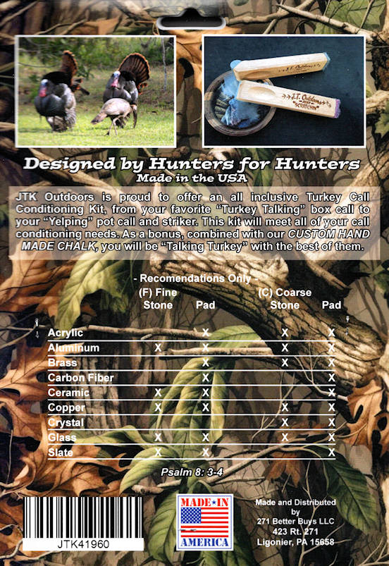 An all inclusive conditioning kit. The capabilities and uses are stated on the retail packaging. This product is different in many ways from our competitors. First of all, it is all-weather. The stones in half circle shape is the key. There is no wrong angle to hold to get a good scratch effect on your calls. The stones are also fine and course for their respective applications. The abrasive pads are much tougher than normal sandpaper which is commonly used. These pads are also an all weather item as well as being in fine and course as another old Weather application, the handle is made of PVC. For a limited time, the handle is available in Solid Cherry Wood. This kit is complete with a custom made chalk block measuring 1/2” x 1” x 4”. This family recipe comes with the coating on the outside to keep the chalk off of your hands and unwanted places. This product has been tested and refined over several years, proving to work very well. We are proud to say it is made right here in our store.